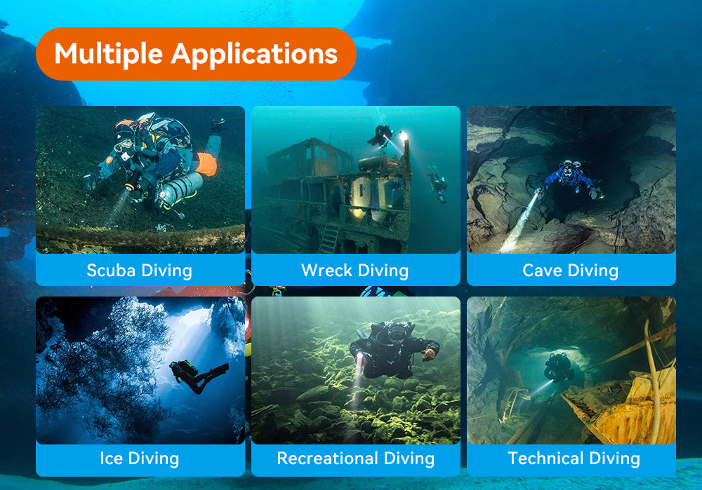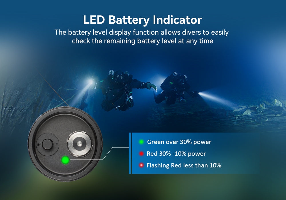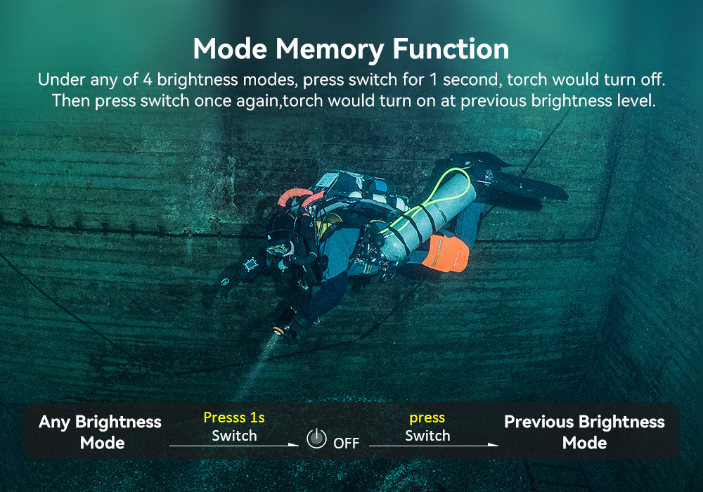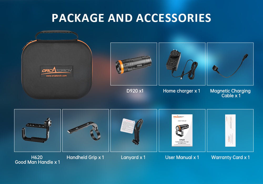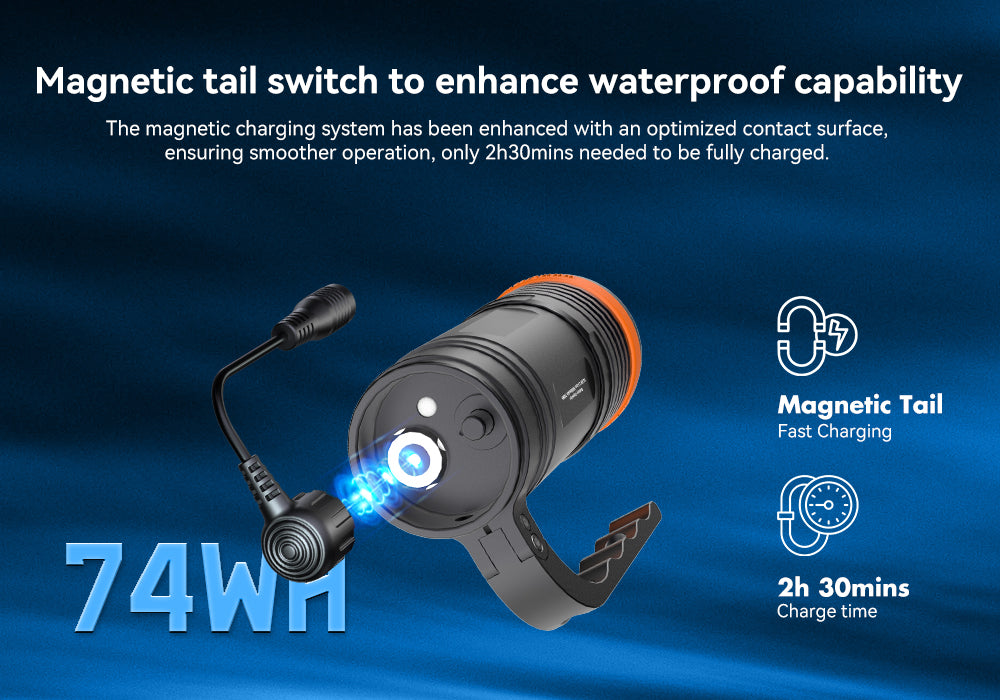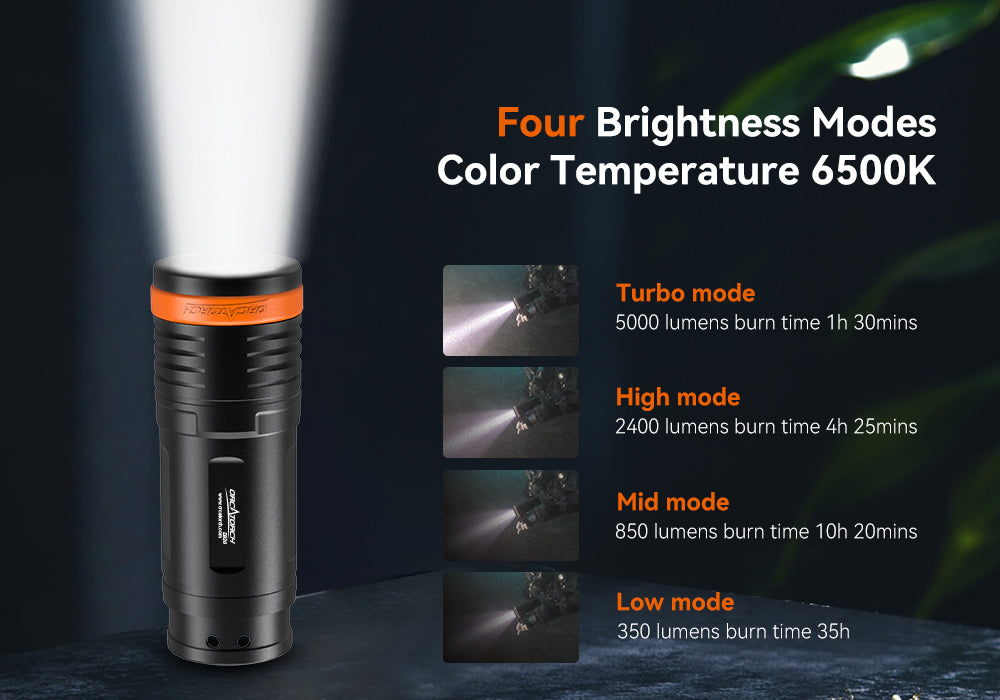 OrcaTorch D920 is a new handheld primary dive light. It delivers an impressive 5000 lumens of brightness with a tightly focused 9° beam that reaches an extraordinary distance of 424 meters on land. Whether you're into recreational or technical diving, it is designed to meet your needs. It runs on a powerful 74Wh rechargeable lithium-ion battery pack and offers four adjustable brightness modes with a color temperature of 6500K. Its magnetic tail switch is specially designed for easy control of these modes and includes a locking function to prevent accidental activation. With its versatility and reliability, D920 is ready to support a wide range of diving adventures.